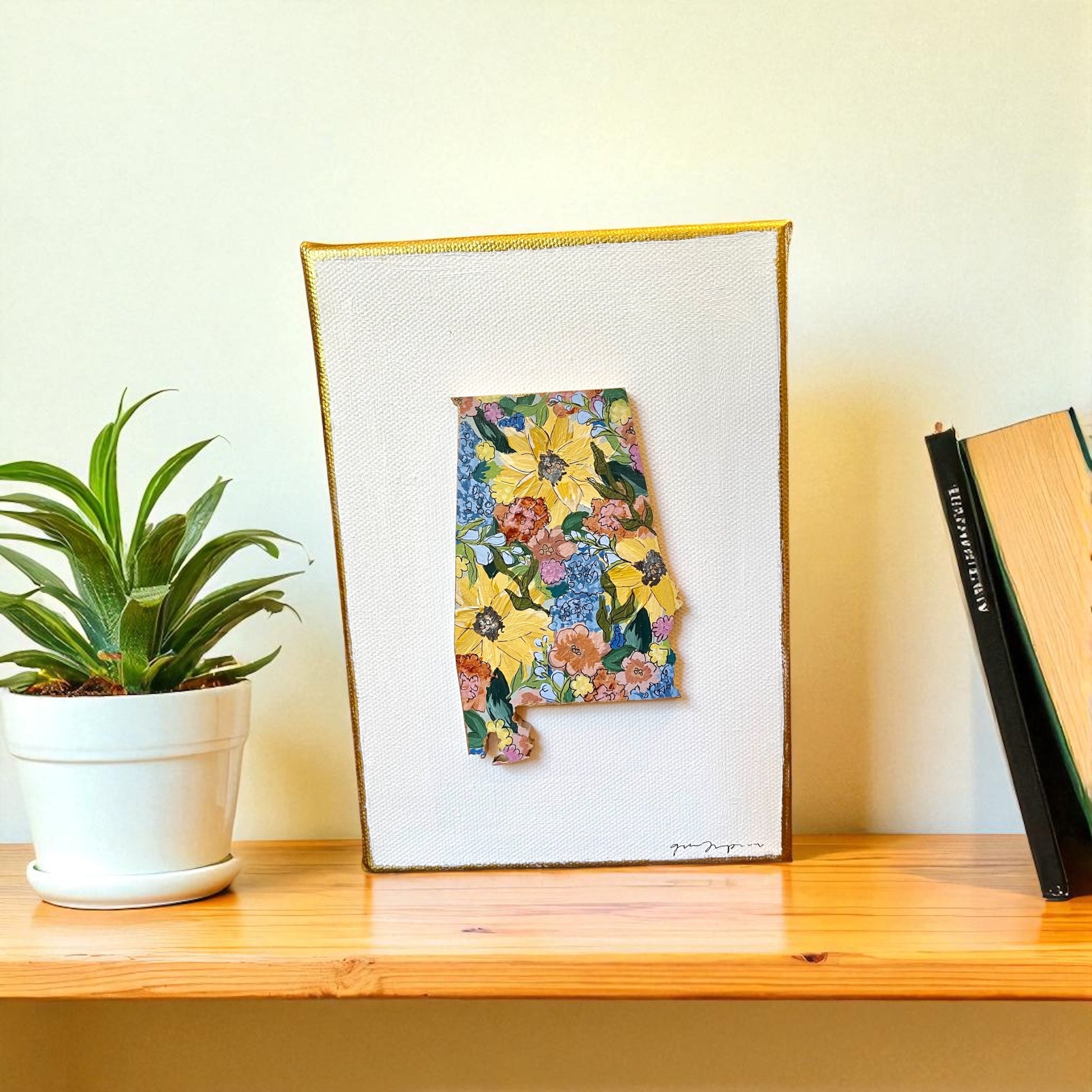 Brighten any space with this shelf art featuring a colorful floral state silhouette mounted on a 5x7 inch canvas.