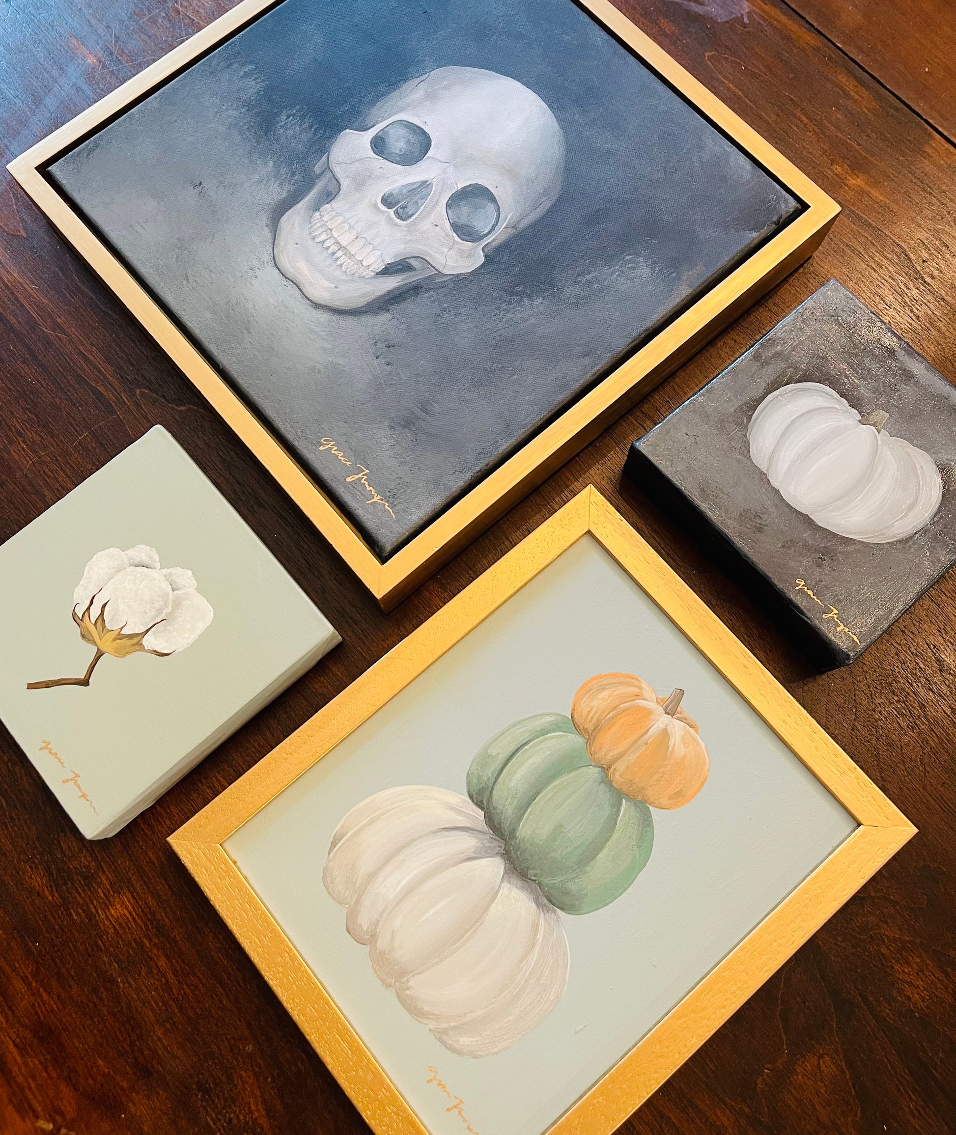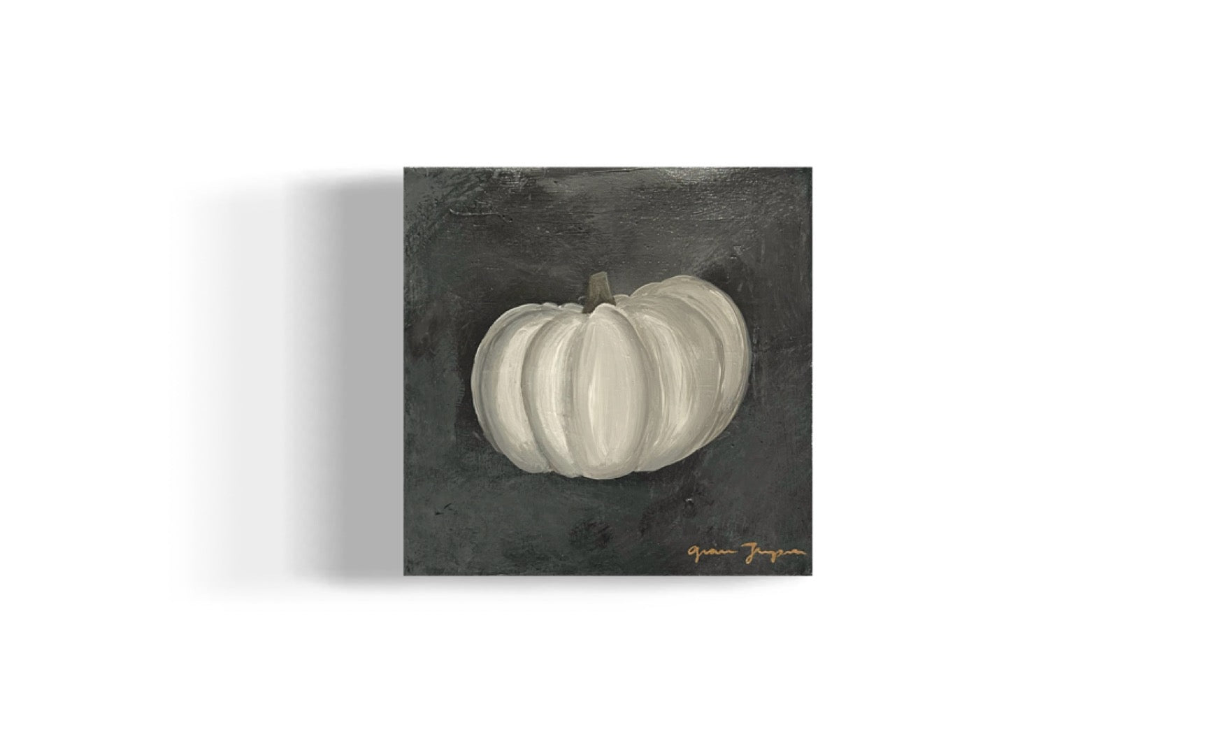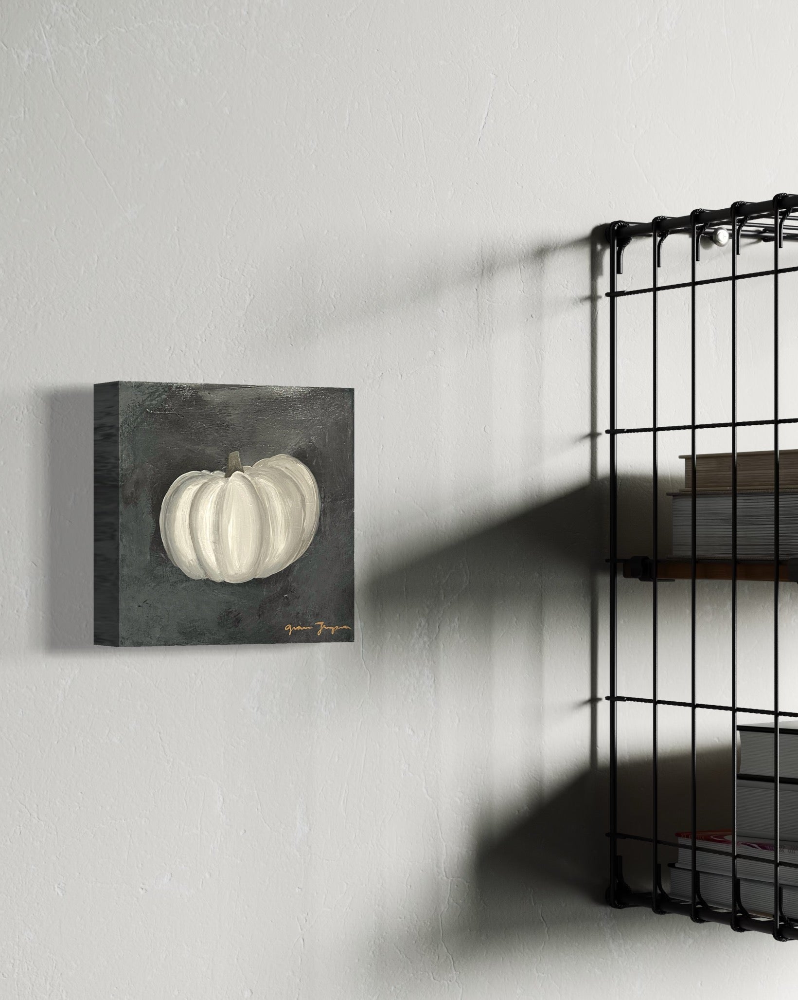 Add a cozy, seasonal touch to your home with this original hand-painted pumpkin artwork. Created on a 6x6 inch stretched canvas, this piece features a simple white pumpkin against a dark background.
