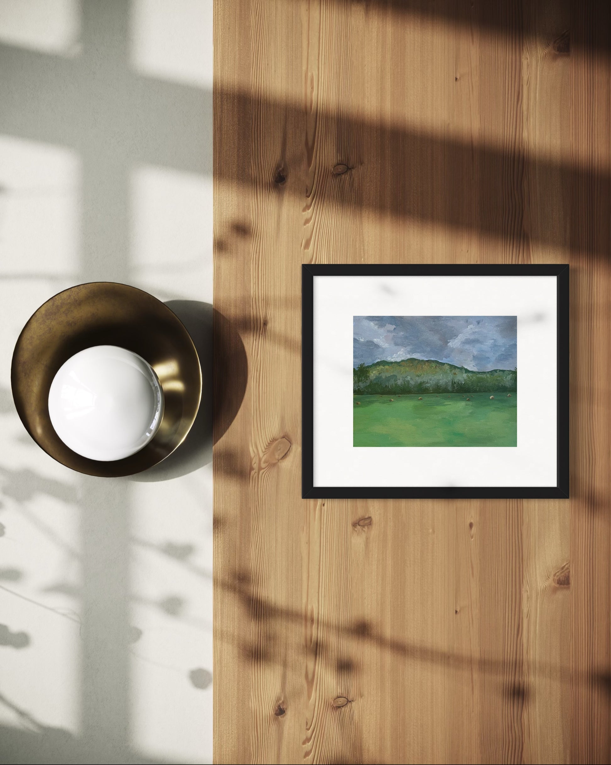This is an 8x10 original acrylic painting on canvas paper. Inspired by a field of hay bales on a farm in Alabama.