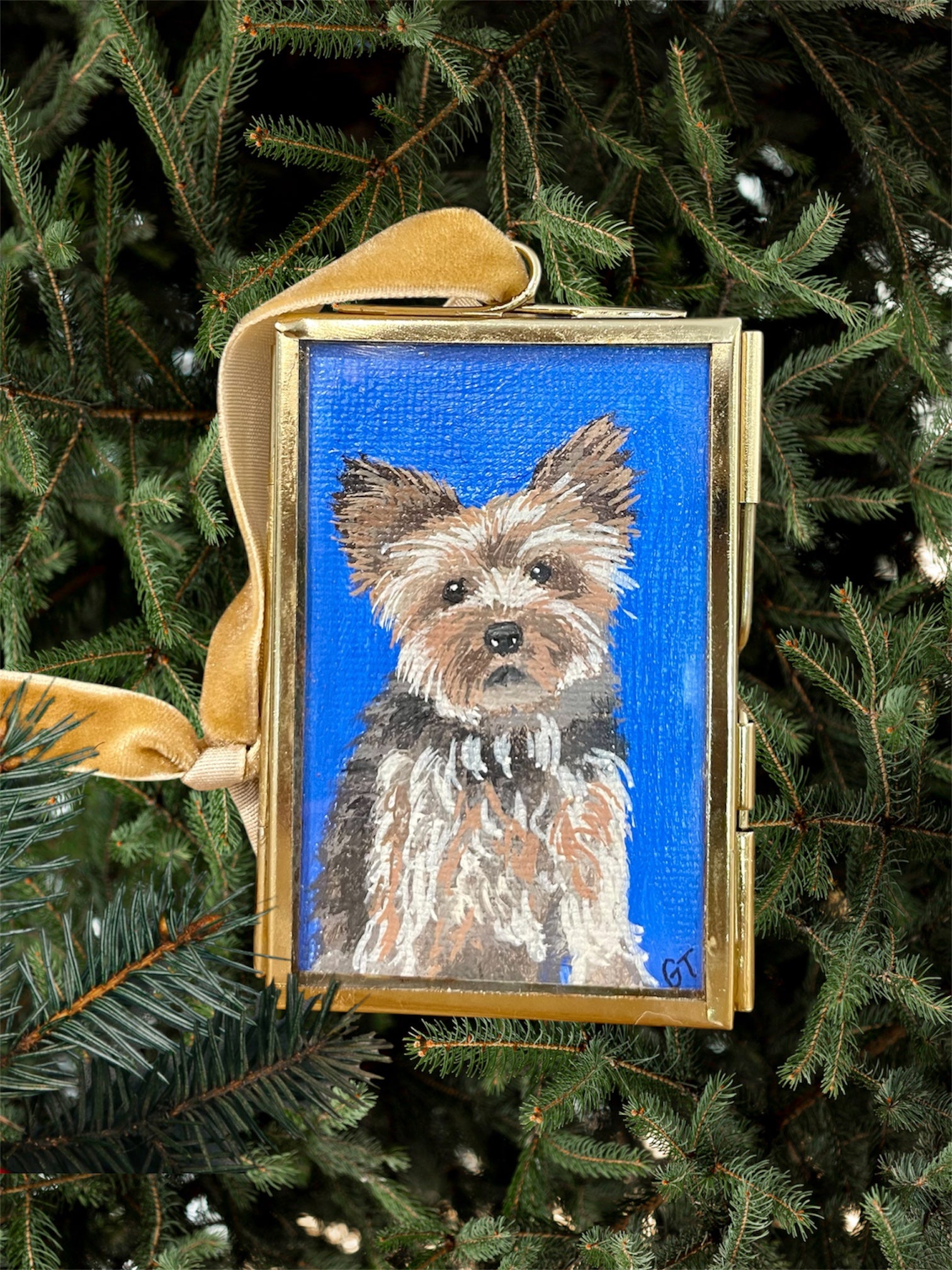 Celebrate your love for your fur-baby with this hand-painted ornament! Each ornament is framed in gold with a glass front and back, and velvet ribbon for hanging. Perfect for adding a personal touch to your Christmas tree or gifting to a fellow dog lover.